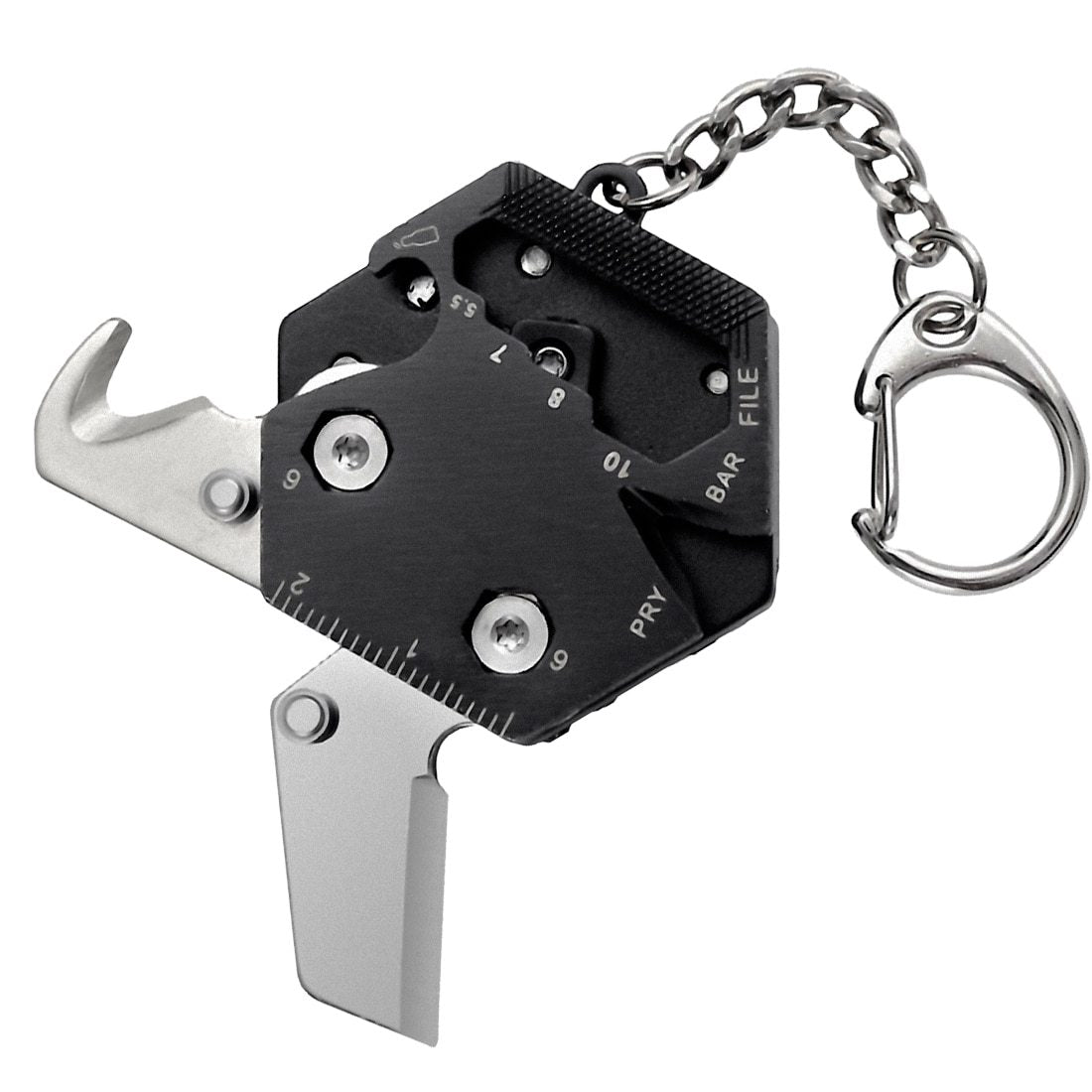 -The multitool keychain has a unique hexagon shape in a modern fashion