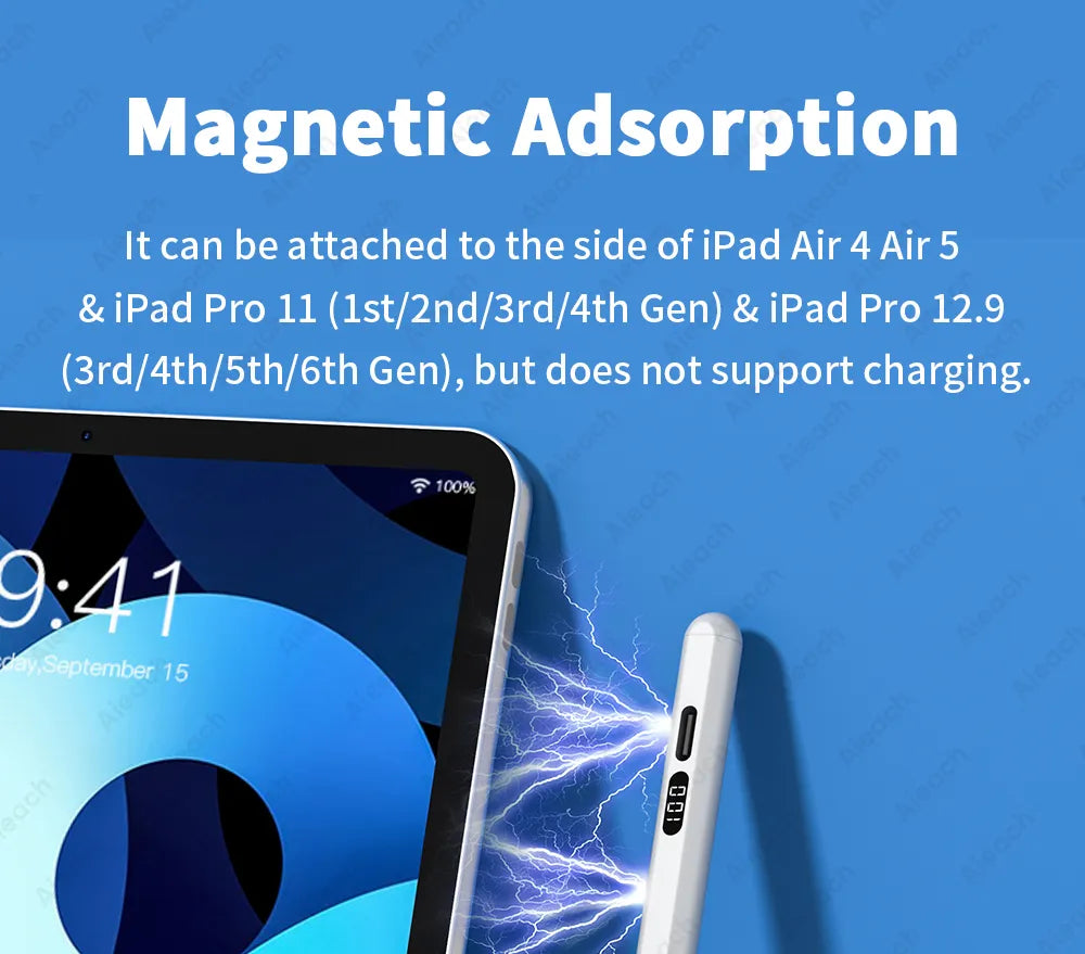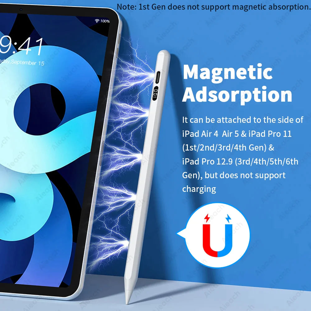Magnetic Adsorption: Designed for convenience, this stylus pen features magnetic adsorption, allowing it to be easily attached to the side of iPad Air 4, Air 5, iPad Pro 11 (1st/2nd/3rd/4th Gen), and iPad Pro 12.9 (3rd/4th/5th/6th Gen). Please note that while it can attach magnetically, it does not support charging through this method.