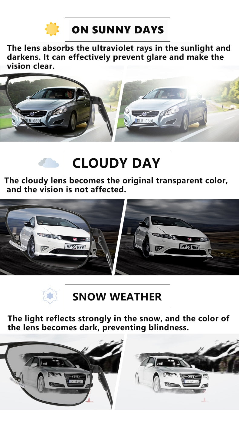 Experience crystal-clear vision with polarized, photochromic, and UV400 lenses, while the alloy frame ensures both comfort and durability. From driving to fishing, and every outdoor activity in between, these sunglasses are your reliable companion.