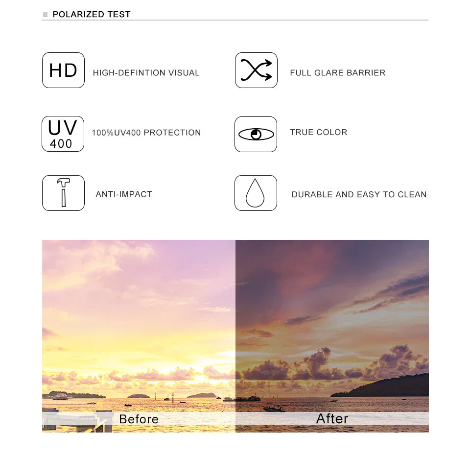 Lightweight and stylish, they are suitable for any outdoor occasions. Offering 100% polarization, these sunglasses eliminate glare, enhancing visual comfort and provide comprehensive UVA and UVB protection for both men and women.
