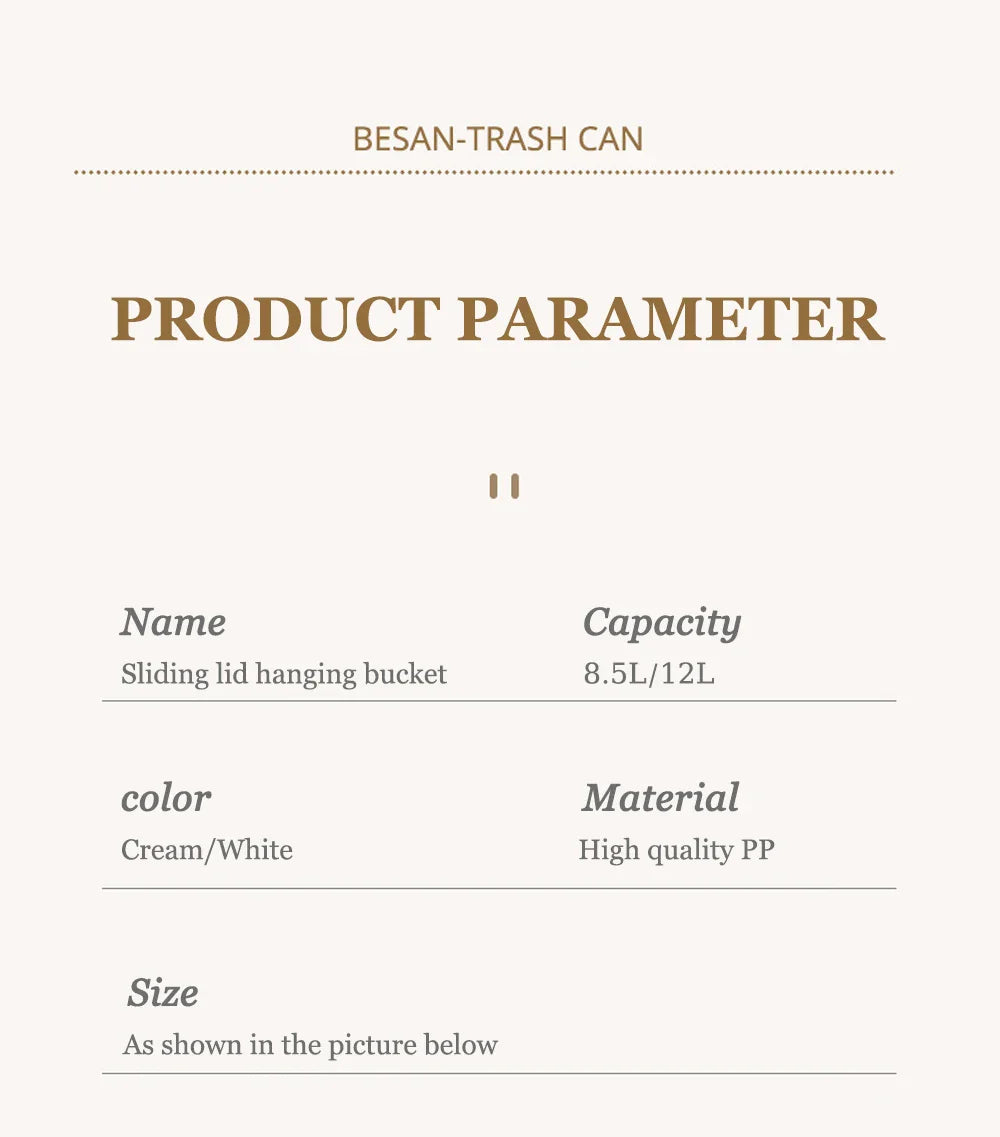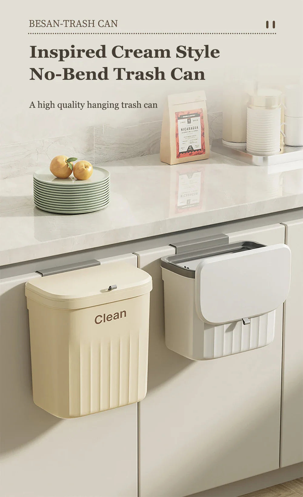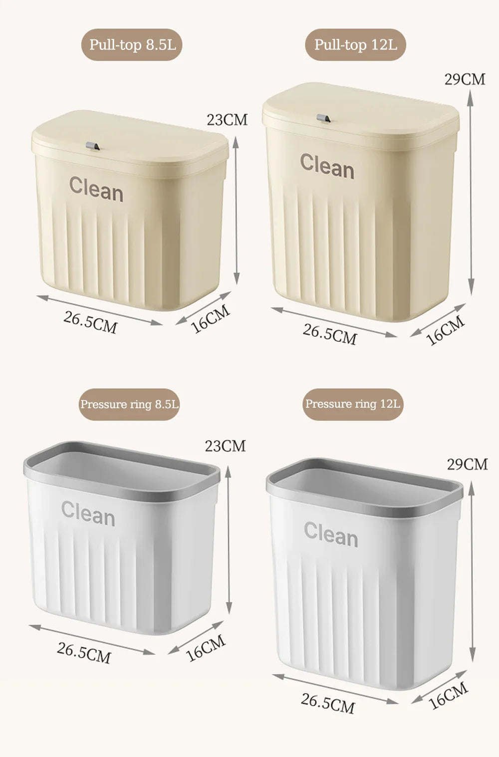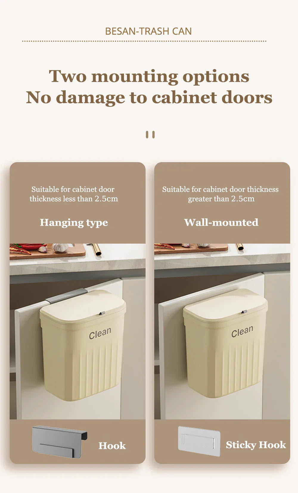 Versatile Installation Options: The trash bin offers multiple installation methods to suit your space. Hang it on kitchen cabinet doors (suitable for doors less than 1 inch thick), attach it to a vertical surface using adhesive hooks or strips, or simply place it on a countertop. Its adaptable design ensures convenience in any kitchen layout.