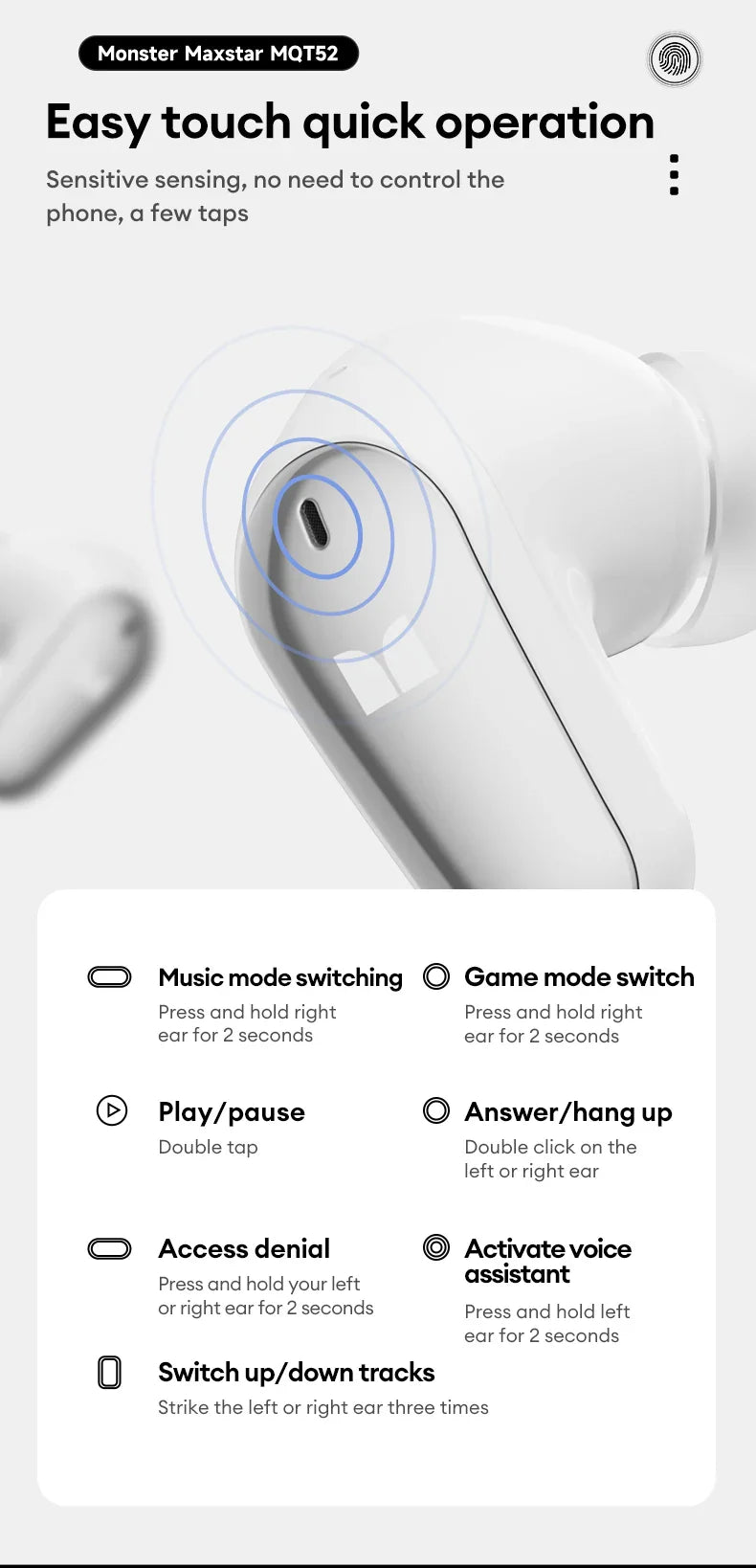 Discover a new level of comfort, clarity, and convenience with the Monster Maxstar MQT52 Wireless Earbuds. Designed for effortless everyday use, they make it simple to enjoy music, calls, and entertainment—without cords, complications, or discomfort.