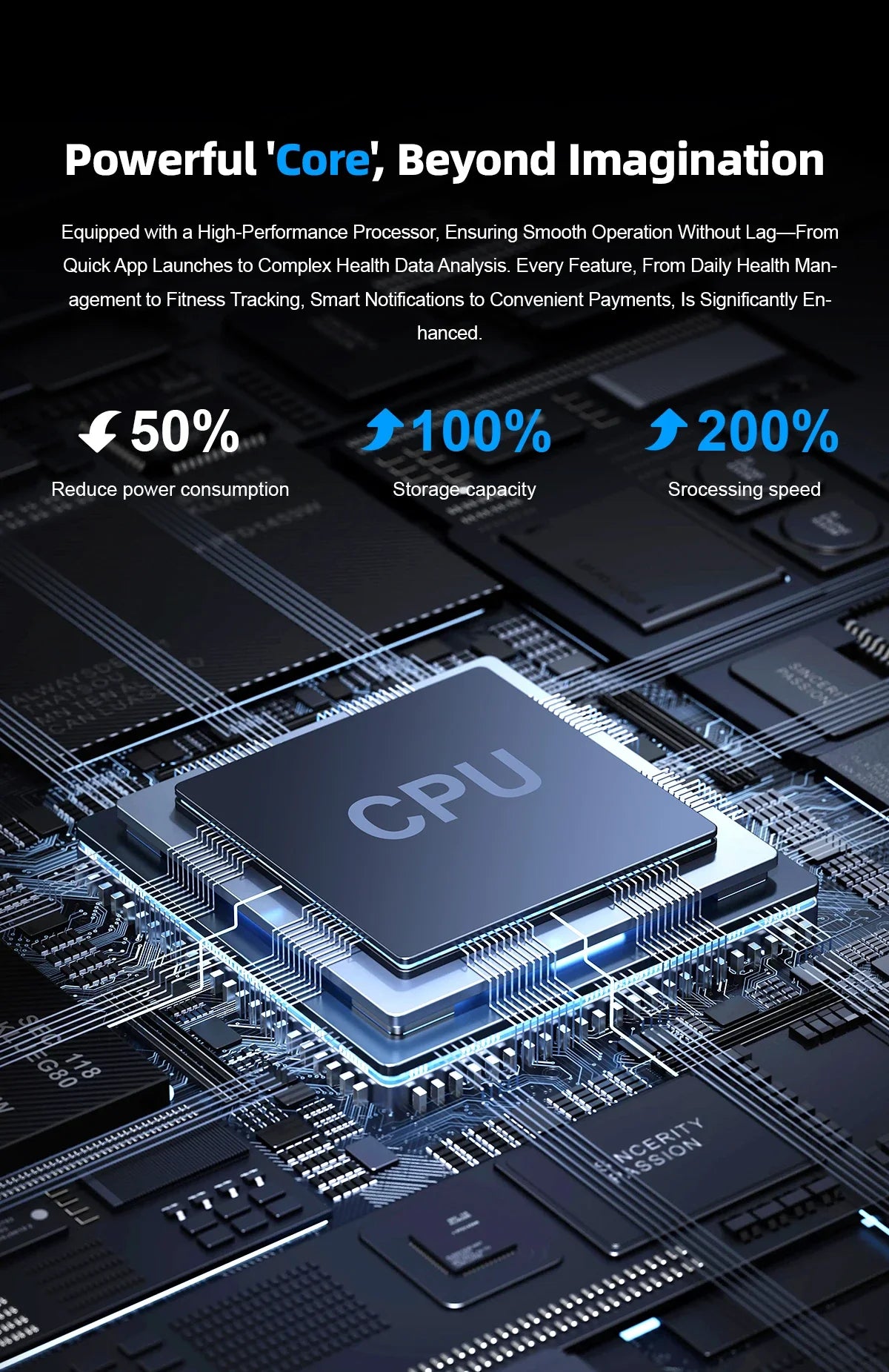Thanks to its high-performance processor, this watch delivers lightning-fast responses. Opening apps, scrolling through menus, and checking your health data is instant and smooth. At the same time, it reduces power consumption by up to 50%, doubling storage space and tripling processing speed compared to older models. You’ll notice the difference every time you use it – less waiting, more doing.