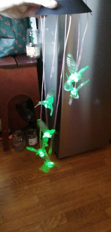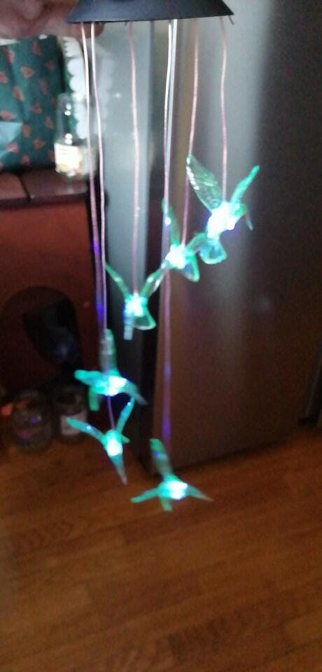 【Hummingbird Solar Wind Chimes】 Keep switched on, the LED solar wind chime will auto charge under direct sunshine. At night, it will Change colors randomly between Red, Green, Orange, Blue, Yellow, Purple. Which can create a mysterious, magical, and spook atmosphere for outdoor decor. It's a great holiday decorative light for the garden, patio