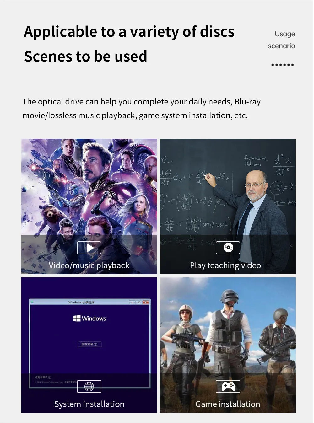 Anti-Friction Design: The DVD player for laptops is constructed with a non-slip rubber pad, providing resistance to friction, impact, water, and ensuring non-slip and shock-resistant qualities. The high-quality build minimizes concerns about breakage.
